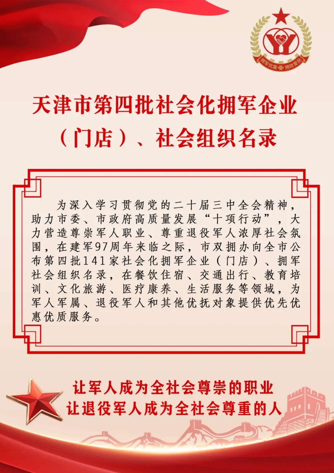 天津市第四批社会化拥军企业(门店)、社会组织优待优惠目录清单