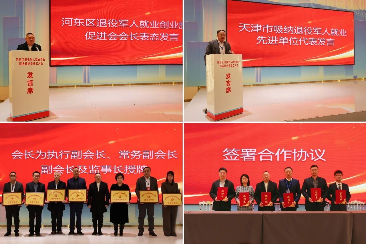 为整合优质资源、拓宽服务路径,促进会与山高环能集团天津分公司、平安保险天津分公司、二七二健康管理中心、成立航空股份有限公司四家企业签订合作协议,为退役军人就业创业引入坚实企业资源支撑;退役军人代表现场签约成功入职,实现了“退伍即就业”的良好开局。天津宽兴文化科技集团董事长刘宽作为天津市吸纳退役军人就业先进单位代表发言,分享了企业吸纳退役军人、助力其成长发展的宝贵经验,为更多企业参与拥军优属、吸纳退役军人就业树立了榜样。
