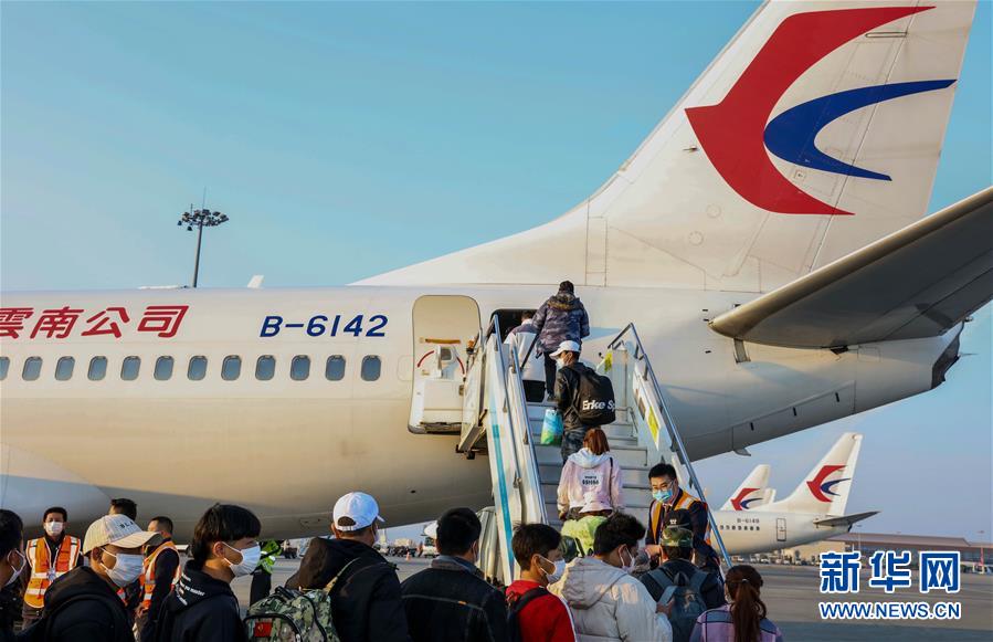 2月26日,云南省组织一批务工人员乘坐东航返岗包机前往山东烟台复工。新华社发(叶勤茹 摄)