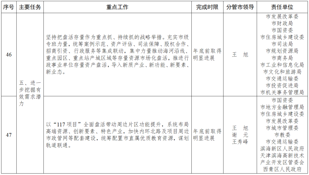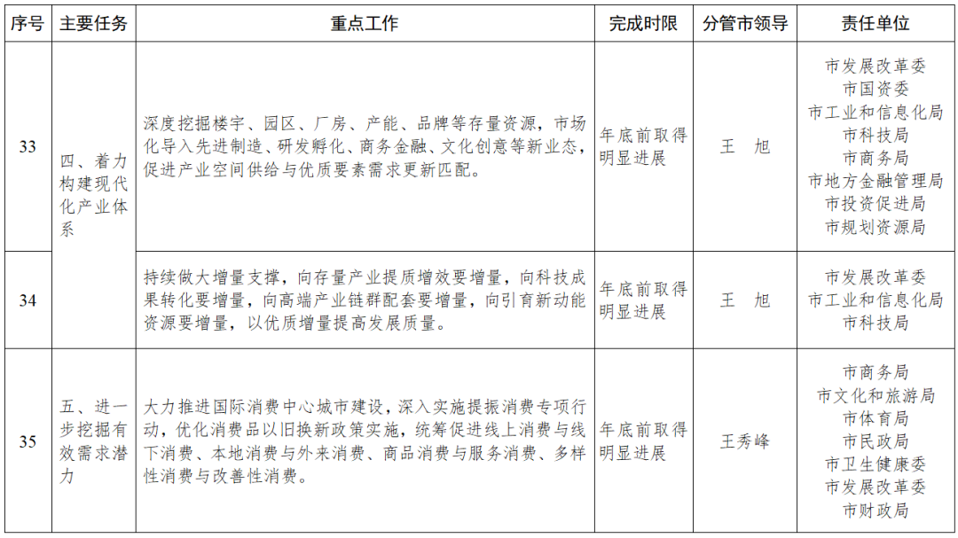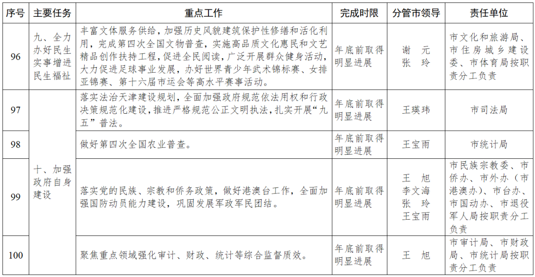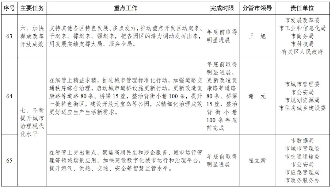 100项重点工作均明确了责任分工,各责任单位要逐项明确工作标准、落实路径、完成时限,主要负责同志要靠前指挥、抓总统筹,分管负责同志要分兵把守、协调推动。牵头单位要发挥统筹作用,加强会商研判,强化组织实施、责任落实;配合单位要主动尽责担责,做好协同配合,凝聚共识,形成同题共答、同向发力、齐抓共管的工作局面。在重点工作推进过程中,各责任单位要担当作为、奋勇争先,凝心聚力、攻坚克难,注重提质增效,在争资源、添动能、抓落实上下功夫,夯实高质量发展支撑。