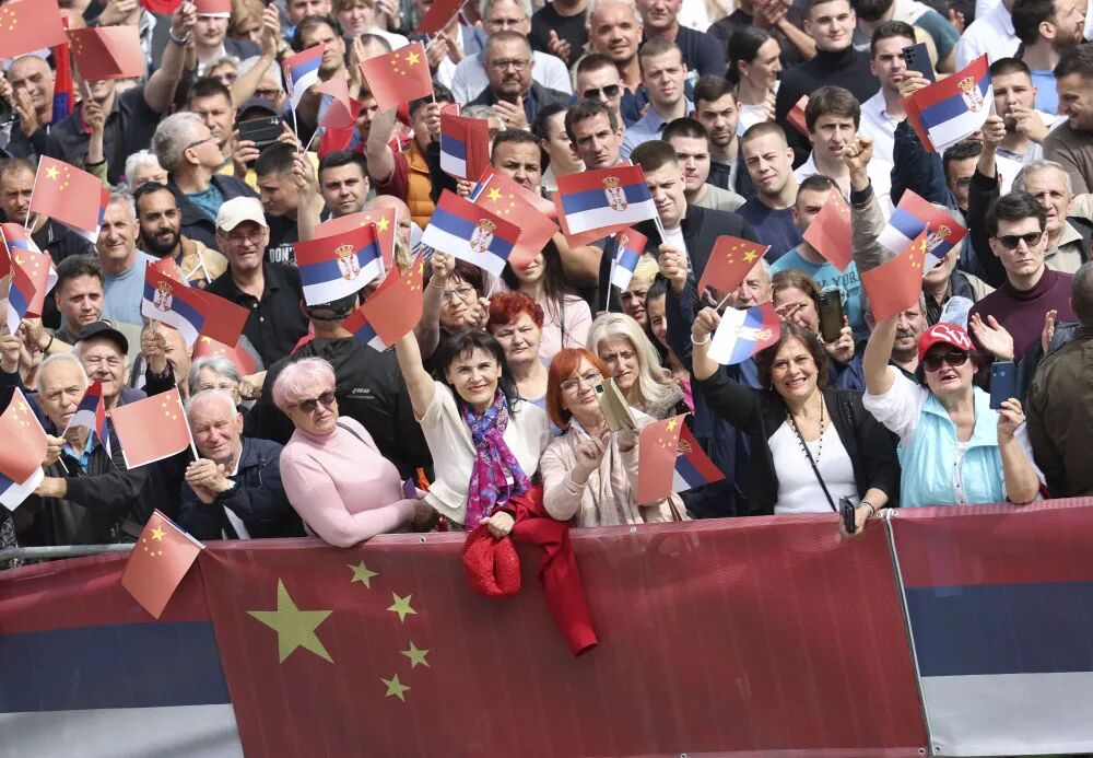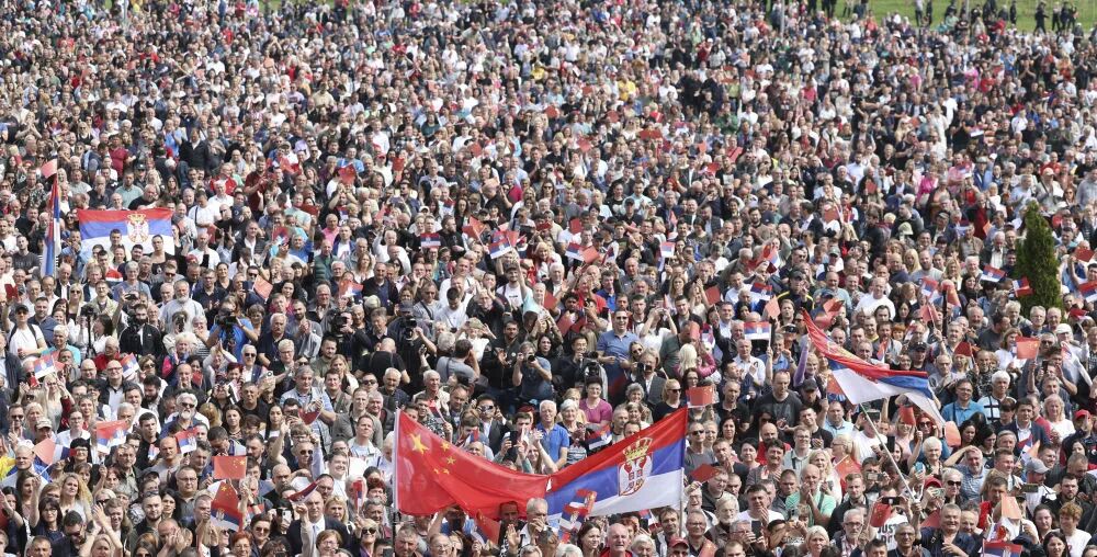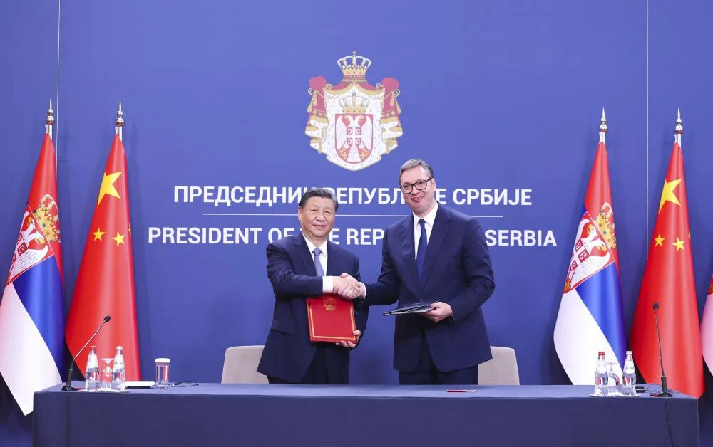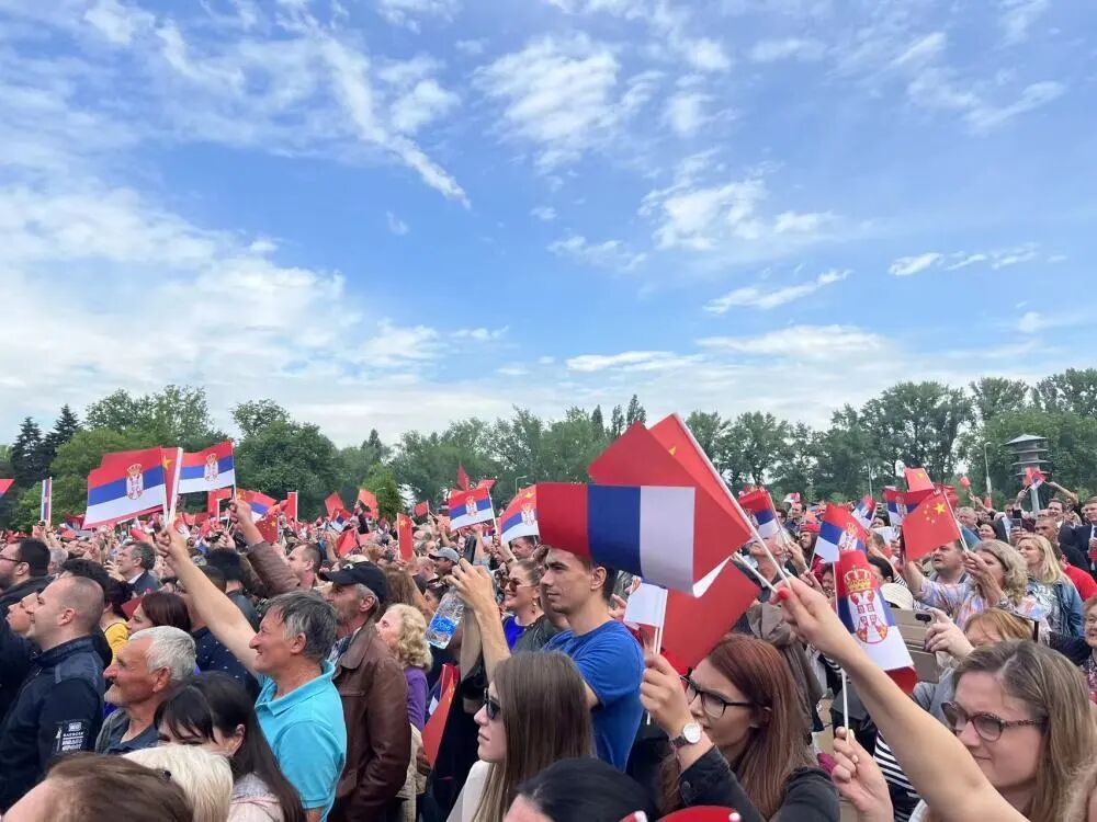 当地时间5月8日,国家主席习近平在贝尔格莱德出席塞尔维亚总统武契奇举行的隆重盛大欢迎仪式。欢迎仪式在塞尔维亚大厦南广场举行。两国元首共同登上检阅台,军乐团奏响中塞两国国歌,鸣10响礼炮。习近平在武契奇陪同下检阅仪仗队。