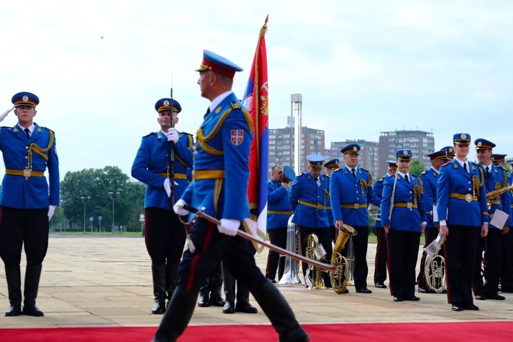 塞尔维亚大厦前,中塞两国国旗迎风飘扬,仪仗队威武雄壮。