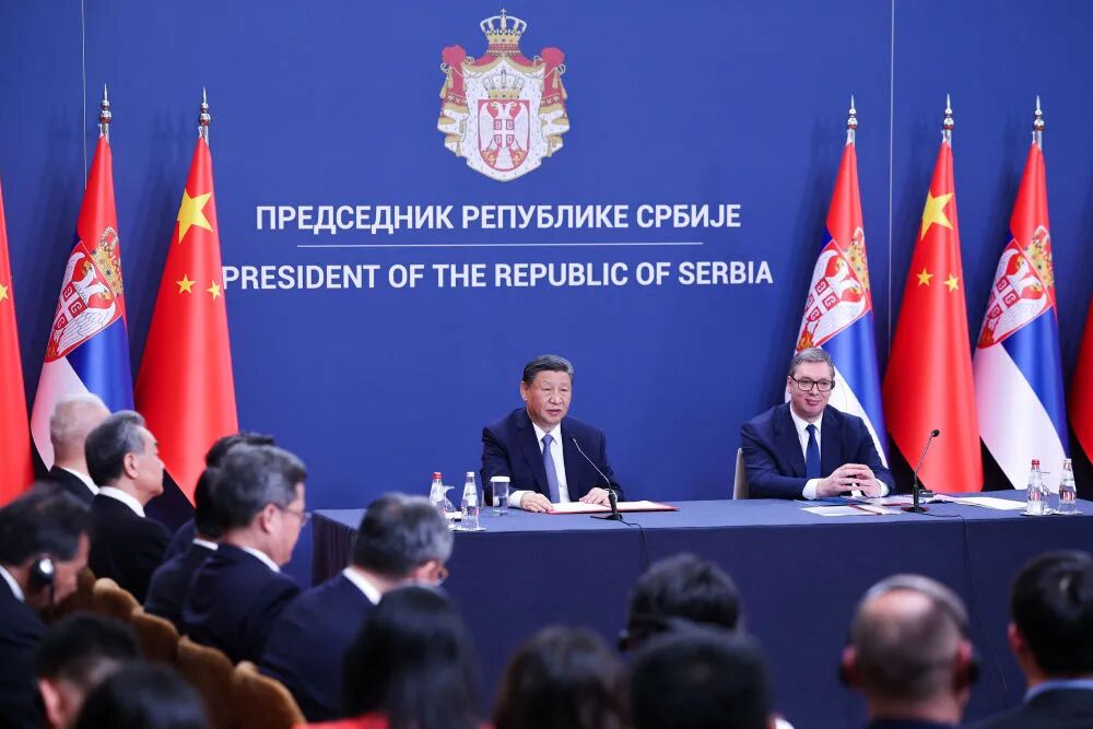 欢迎仪式后,国家主席习近平在贝尔格莱德塞尔维亚大厦同塞尔维亚总统武契奇举行会谈。