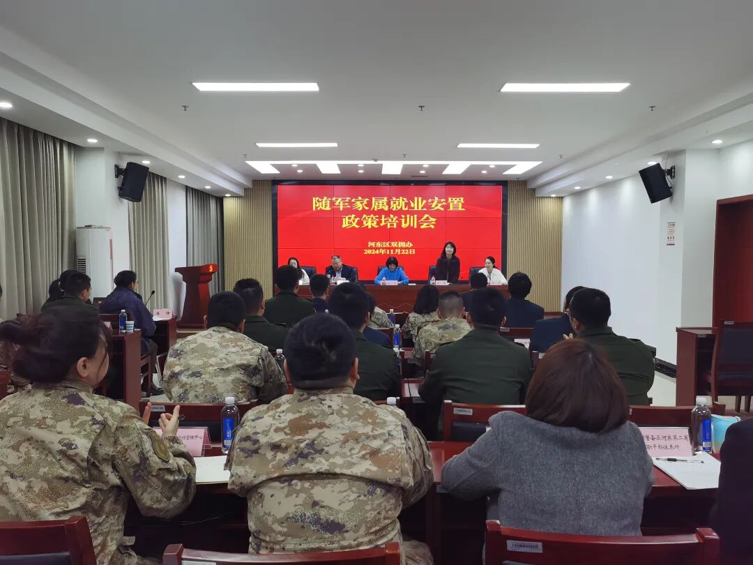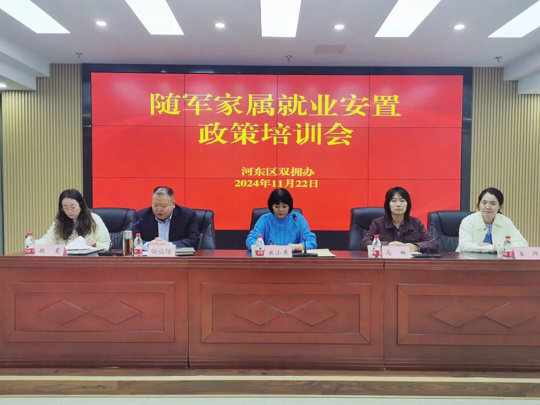 为进一步贯彻落实《天津市军人随军家属就业安置办法》,压实随军家属就业安置政治责任,实现随军家属充分就业,切实理顺关系、规范程序、严格标准。近日,河东区退役军人事务局组织随军家属安置业务政策培训,市引进人才综合服务中心副主任宋小东、区退役军人事务局副局长张弘弢、区人力资源和社会保障局副局长尚琳出席会议。