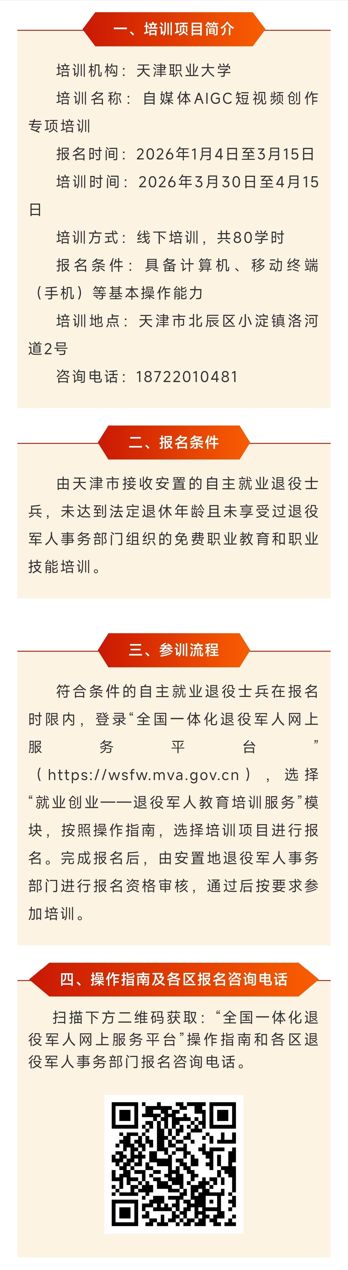 自主就业退役士兵职业技能培训报名公告——自媒体AIGC短视频创作专项培训