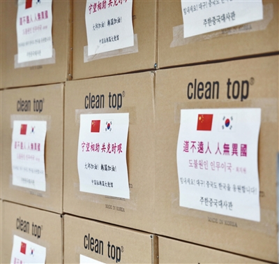 2月27日,在韩国首尔,中国驻韩国大使馆紧急筹备的医用口罩准备运往大邱。