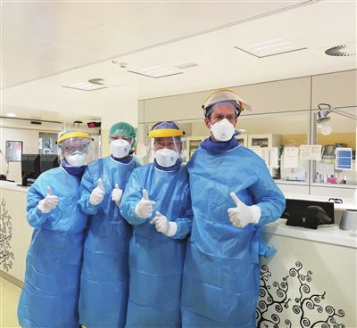 3月18日,在意大利帕多瓦,中国抗疫医疗专家组成员与当地医生合影。