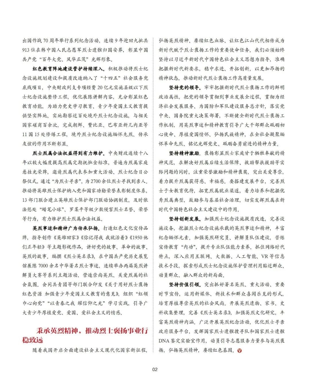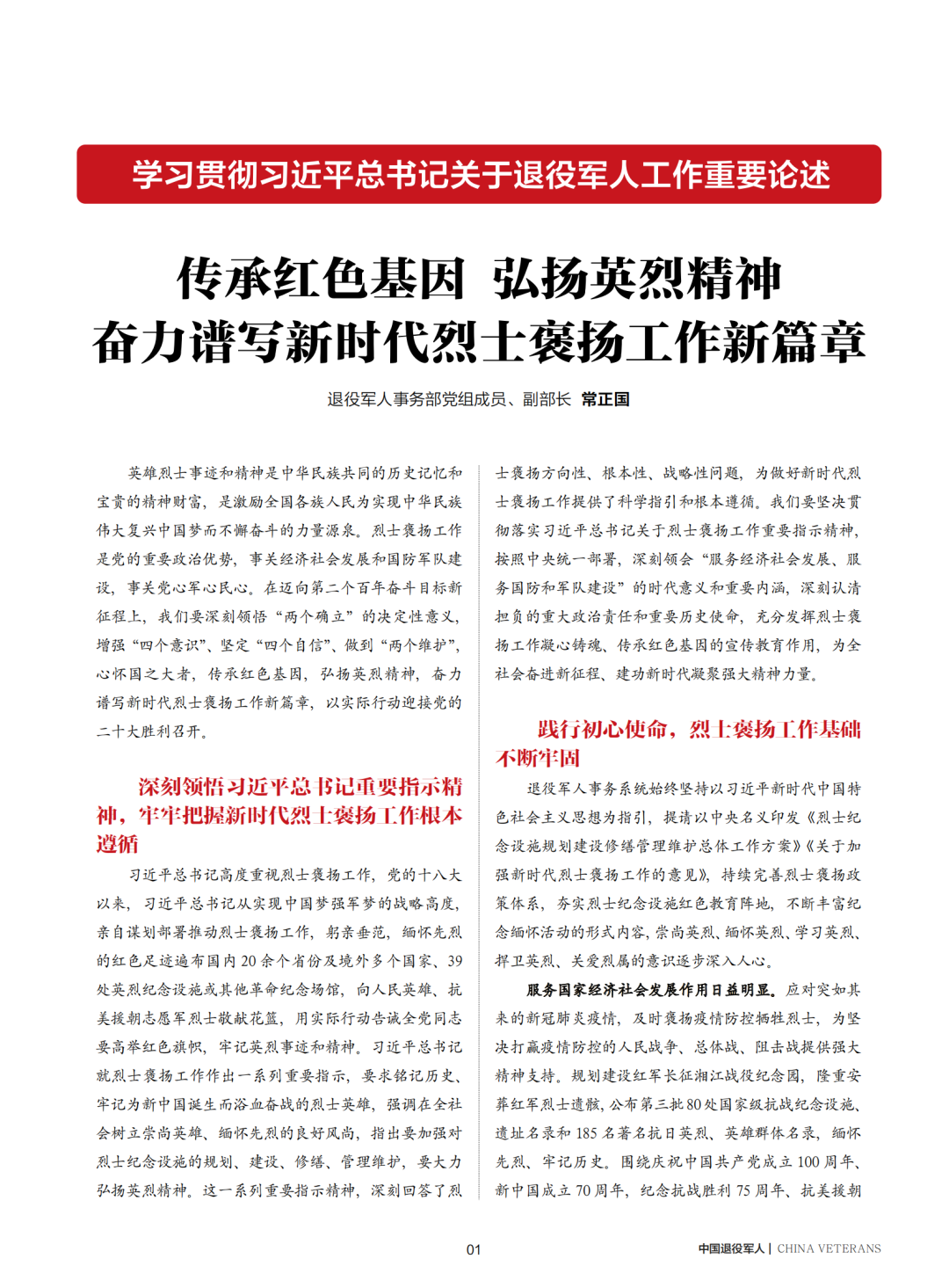 《中国退役军人》杂志2022年第十期在重要位置推出“学习贯彻习近平总书记关于退役军人工作重要论述”专栏,刊发了退役军人事务部党组成员、副部长常正国署名文章《传承红色基因 弘扬英烈精神,奋力谱写新时代烈士褒扬工作新篇章》。